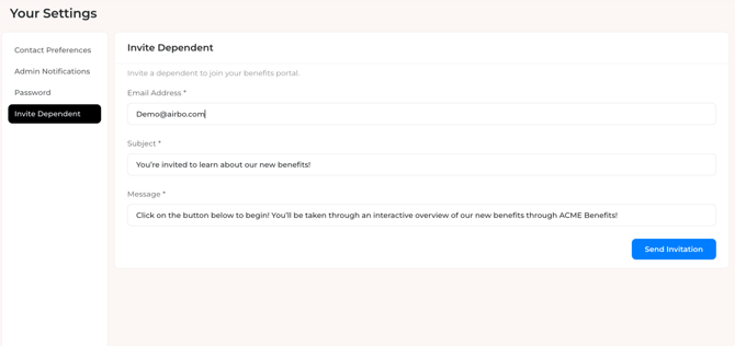 Employees can invite a dependent to Airbo directly from their Account Settings. This article covers how to enable the feature, how it works for employees, and what to expect in user exports and bulk uploads.