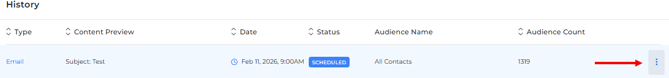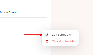 I want to change the scheduled time Click the three dots on the right side of your scheduled broadcast in the History table. Select "Edit Schedule" to pick a new date and time without canceling.