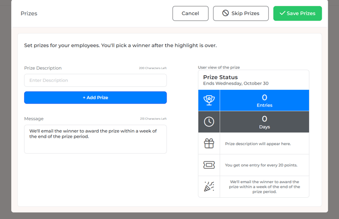 Prizes are an optional way to incentivize employees to engage with your Highlights. Many HR teams use gift cards, swag, or vendor donations as rewards. Employees earn entries by completing tiles, and their entries put them into a raffle for a chance to win.